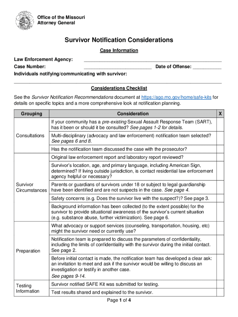 Office of the Missouri Attorney GeneralSurvivor Notification Considerations Case Information Law Enforcement Agency: ___ Case Number: ___ Date of Offense: ___ Individuals notifying/communicating with