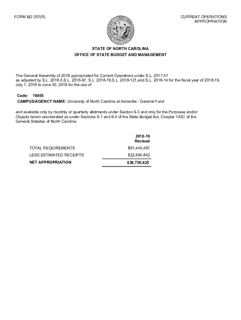 FORM BD 307(R)CURRENT OPERATIONS APPROPRIATIONSTATE OF NORTH CAROLINA OFFICE OF STATE BUDGET AND Management General Assembly of 2018 appropriated for Current Operations under S.L. 201757 as adjusted