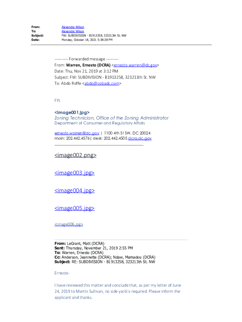 From: To: Subject: Date:Alexandra Wilson FW: SUBDIVISION B1913258, 323213th St. NW Monday, October 18, 2021 5:38:38 PM Forwarded message From: Warren, Ernesto (DORA) ernesto.warren@dc.gov Date: Thu,