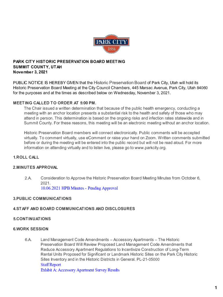 PARK CITY HISTORIC PRESERVATION BOARD MEETING SUMMIT COUNTY, UTAH November 3, 2021, PUBLIC NOTICE IS HEREBY GIVEN that the Historic Preservation Board of Park City, Utah will hold its Historic Preservation