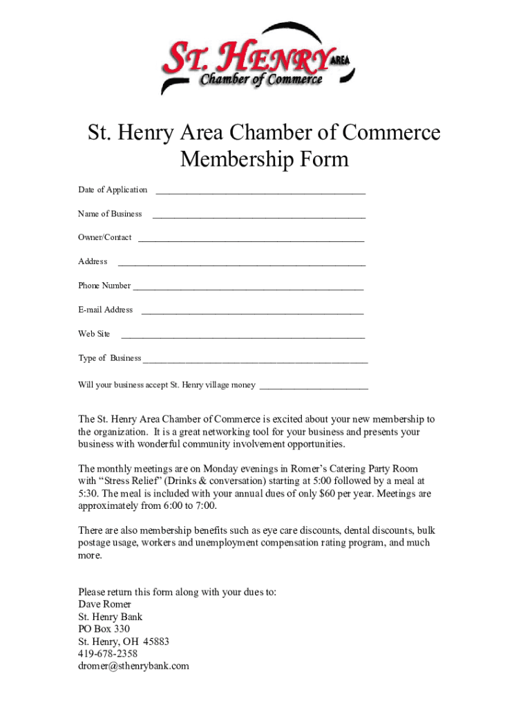 St. Henry Area Chamber of Commerce Membership Form Date of Application Name of Business___ ___Owner/Contact ___ Address___Phone Number ___ Email Address Web Site______Type of Business ___ Will your