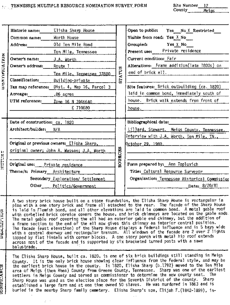 TENNESSEE MULTIPLE RESOURCE NOMINATION Survey Prehistoric name: Common name: Address: z D in \'J ×4 zi4 3Owner\'s name: Owner\'s address:Elisha Sharp House Worth House Old Ten Mile Road Ten Mile,
