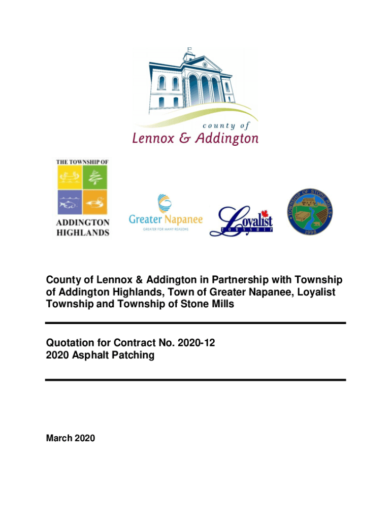 County of Lennox & Addington in Partnership with Township of Addington Highlands, Town of Greater Napa née, Loyalist Township and Township of Stone Misquotation for Contract No. 202012 2020 Asphalt