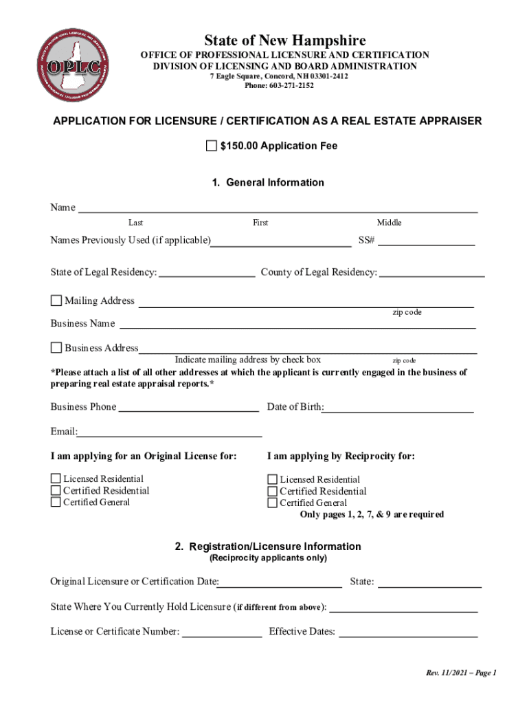 State of New Hampshire OFFICE OF PROFESSIONAL LICENSURE AND CERTIFICATION DIVISION OF LICENSING AND BOARD ADMINISTRATION 7 Eagle Square, Concord, NH 033012412 Phone: 6032712152APPLICATION FOR LICENSURE