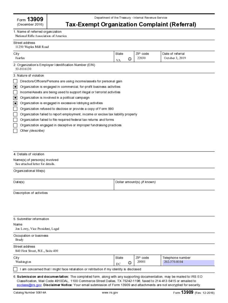 Form 13909 can be filled out online or by mail. The form requires information about the alleged violation and the organization involved.