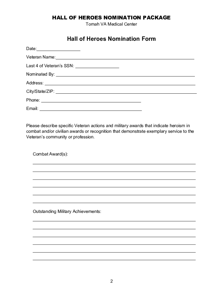 HALL OF HEROES NOMINATION PACKAGE Torah VA Medical Center Purpose: The purpose of the Hall of Heroes is to recognize military Veterans supported by the Torah VA Medical Center and associated outreach