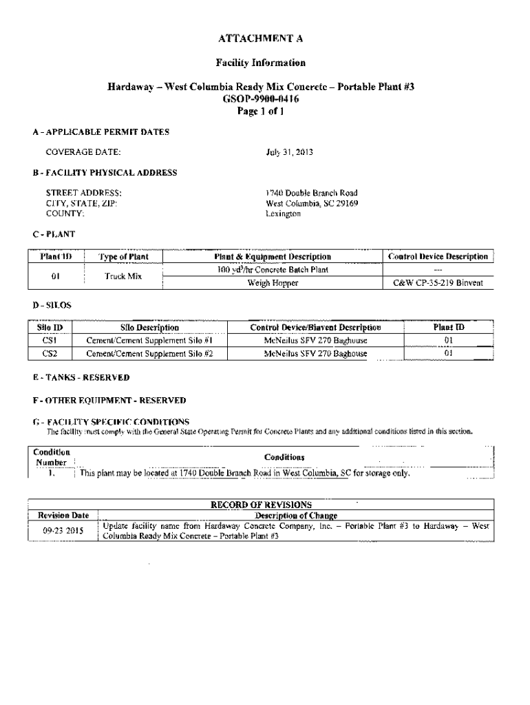 ATTACHMENT Facility InformationHardaway West Columbia Ready Mix Concrete Portable Plant #3GSOP99000416