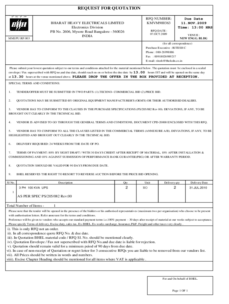 REQUEST FOR QUOTATION MMI:PU:RF:003RFQ NUMBER: KMVM900363BHARAT HEAVY ELECTRICAL LIMITED Electronics Division PB No. 2606, Mysore Road Bangalore 560026 Inside Date 11.NOV.2009 Time: 13:00 ESRF DATE