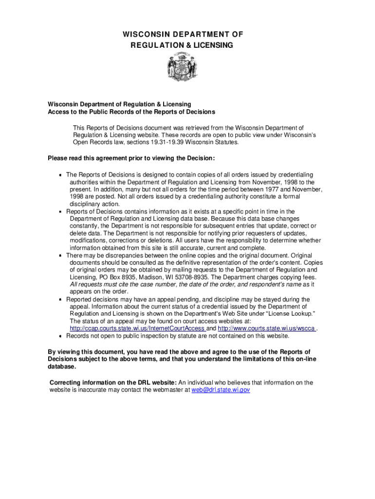 WISCONSIN DEP APARTMENT OF REGULATION & LICENSING Wisconsin Department of Regulation & Licensing Access to the Public Records of the Reports of Decisions This Reports of Decisions document was retrieved