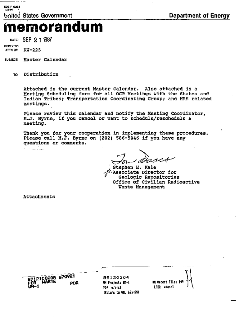DOE F 1325.8(\'24^ \'_\'.:listed States GovernmentDepartment of Energy memorandum DATE:SEP 2 1 1987REPLY TO ATTN OF:RW223SUBJECT:Master Calendar TO:Distribution Attached is the current Master Calendar.