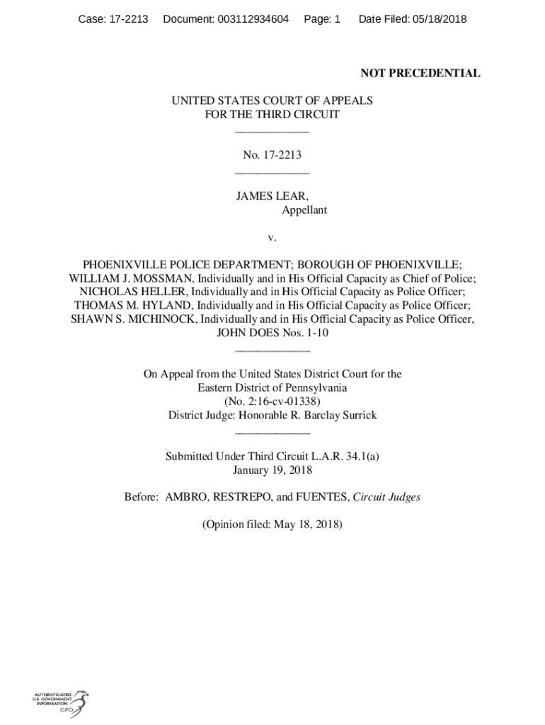 Case: 172213Document: 003112934604Page: 1Date Filed: 05/18/2018NOT PRESIDENTIAL UNITED STATES COURT OF APPEALS FOR THE THIRD CIRCUIT ___ No. 172213 ___ JAMES LEAR, Appellant v. PHOENIXVILLE POLICE
