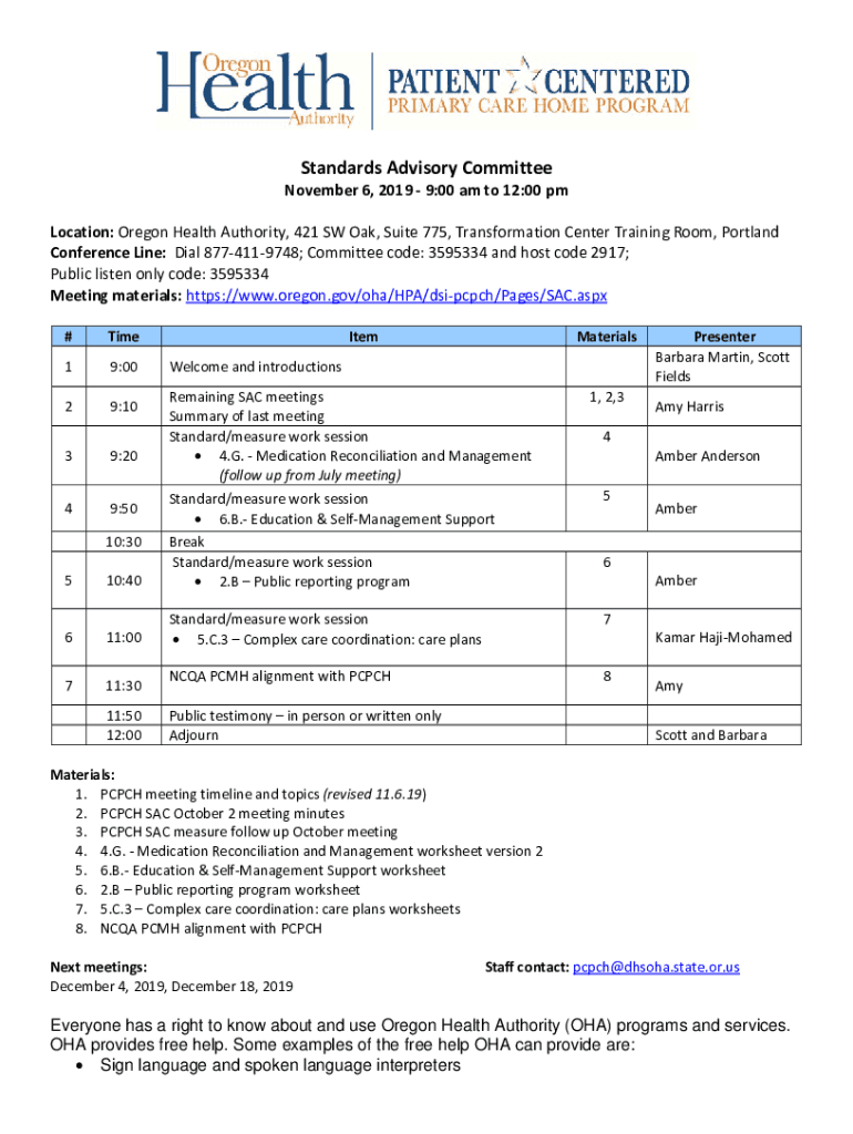 Standards Advisory Committee November 6, 2019 9:00 am to 12:00 pm Location: Oregon Health Authority, 421 SW Oak, Suite 775, Transformation Center Training Room, Portland Conference Line: Dial 8774119748;