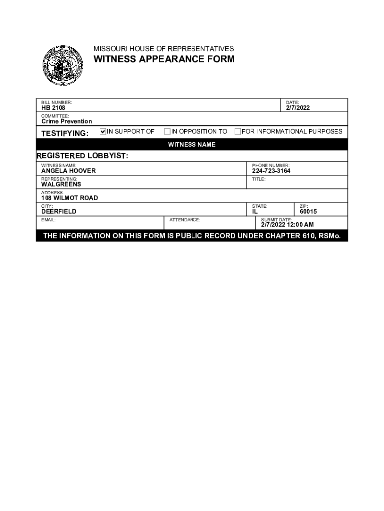 MISSOURI HOUSE OF REPRESENTATIVESWITNESS APPEARANCE FOOTBALL NUMBER:DATE:HE 21082/7/2022COMMITTEE:Crime PreventionTESTIFYING:IN SUPPORT ODIN OPPOSITION TOF OR INFORMATIONAL PURPOSESWITNESS PREREGISTERED