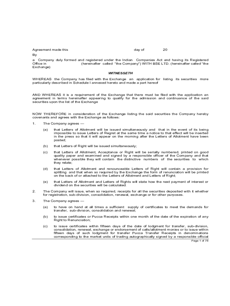 Agreement made this day of20By a Company duly formed and registered under the Indian Companies Act and having its Registered Office in (hereinafter called the Company) WITH BSE LTD. (hereinafter called