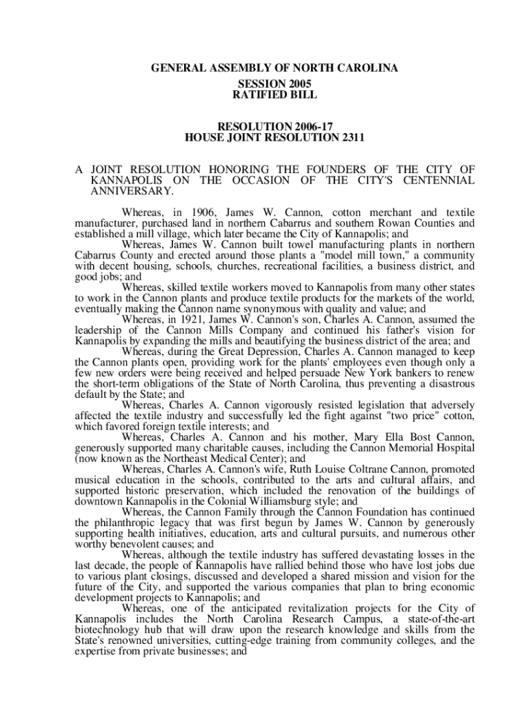 GENERAL ASSEMBLY OF NORTH CAROLINA SESSION 2005 RATIFIED BILL RESOLUTION 200617 HOUSE JOINT RESOLUTION 2311 A JOINT RESOLUTION HONORING THE FOUNDERS OF THE CITY OF KANNAPOLIS ON THE OCCASION OF THE
