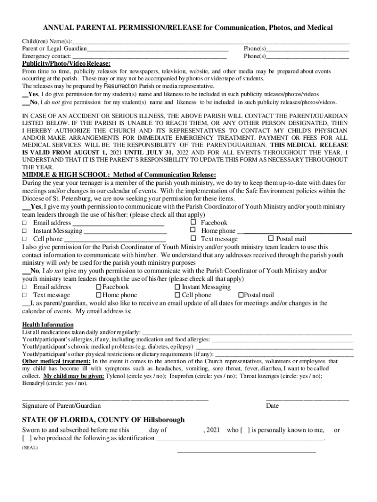 Get the free ANNUAL PARENTAL PERMISSION/RELEASE for Communication, Photos, and Medical