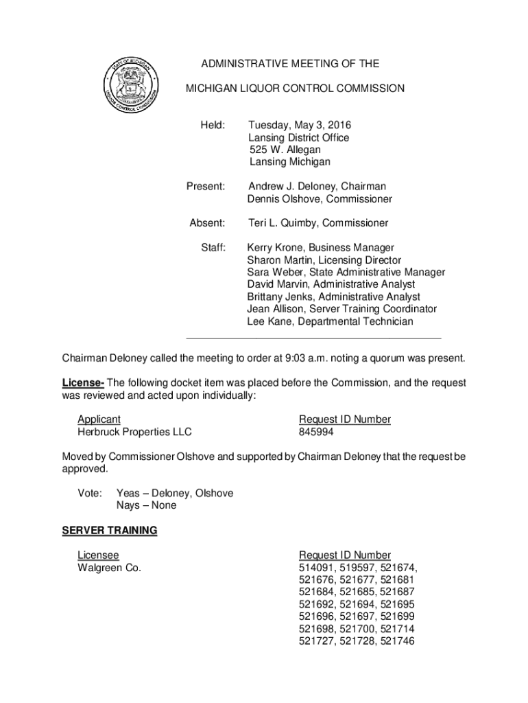 ADMINISTRATIVE MEETING OF THE MICHIGAN LIQUOR CONTROL Commissioned:Tuesday, May 3, 2016, Lansing District Office 525 W. Alleged Lansing MichiganPresent:Andrew J. Delaney, Chairman Dennis Onshore,