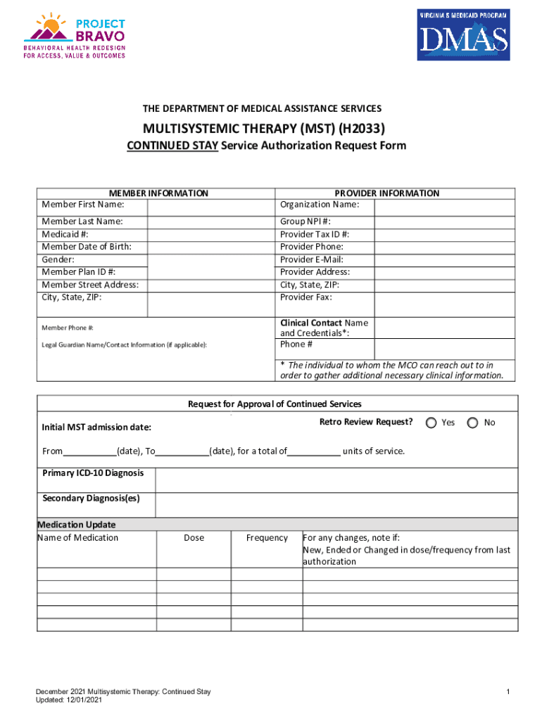 Get the free Multisystemic Therapy (H2033) Continued Stay Service Authorization Form