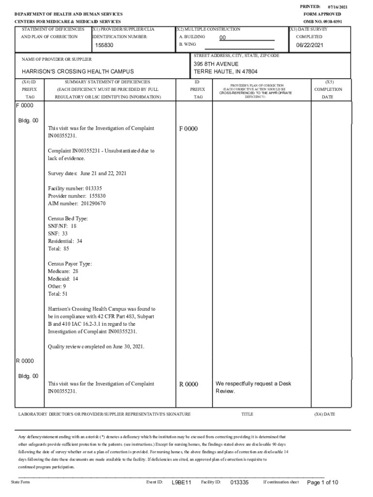 PRINTED: DEPARTMENT OF HEALTH AND HUMAN SERVICES CENTERS FOR MEDICARE & MEDICAID SERVICES STATEMENT OF DEFICIENCIES(X1) PROVIDER/SUPPLIER/LIGAND PLAN OF CORRECTIONIDENTIFICATION NUMBER:15583007/16/2021FORM