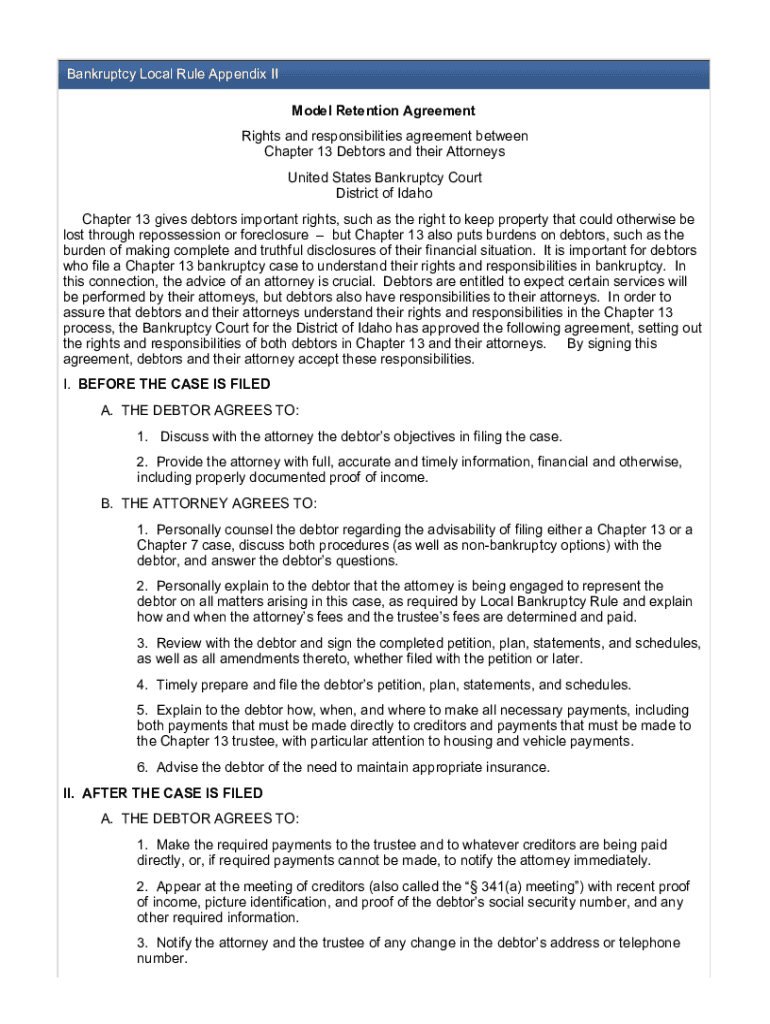 Bankruptcy Local Rule Appendix II Model Retention Agreement Rights and responsibilities agreement between Chapter 13 Debtors and their Attorneys United States Bankruptcy Court District of Idaho Chapter