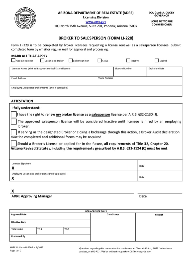 ARIZONA DEPARTMENT OF REAL ESTATE ARE) Licensing DivisionDOUGLAS A. DUCEY Governor.are.gov 100 North 15th Avenue, Suite 201, Phoenix, Arizona 85007LOUIS RESTORE COMMISSIONERBROKER TO SALESPERSON (FORM