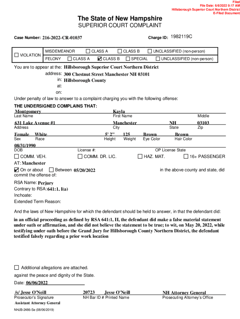 Filed File Date: 6/6/2022 9:17 AM Hillsborough Superior Court Northern District Filed Document State of New Hampshire SUPERIOR COURT COMPLAINT Case Number:2162022CR01037Charge ID:MISDEMEANORCLASS