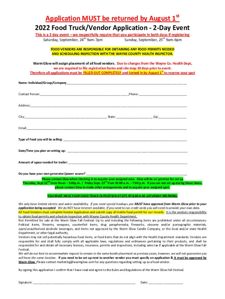 Application MUST be returned by August 1st 2022 Food Truck/Vendor Application 2Day Event This is a 2-day event we respectfully require that you participate in both days if registering Saturday, September,