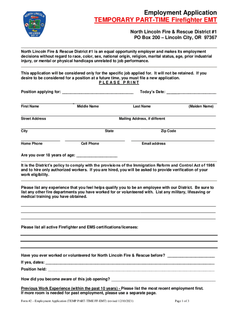 Employment Application TEMPORARY PART TIME Firefighter EMT North Lincoln Fire & Rescue District #1 PO Box 200 Lincoln City, OR 97367 North Lincoln Fire & Rescue District #1 is an equal opportunity