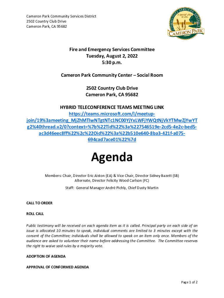 Cameron Park Community Services District 2502 Country Club Drive Cameron Park, CA 95682Fire and Emergency Services Committee Tuesday, August 2, 2022 5:30 p.m. Cameron Park Community Center Social