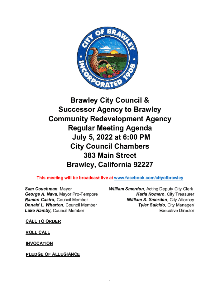 Bradley City Council & Successor Agency to Bradley Community Redevelopment Agency Regular Meeting Agenda July 5, 2022, at 6:00 PM City Council Chambers 383 Main Street Bradley, California 92227 This