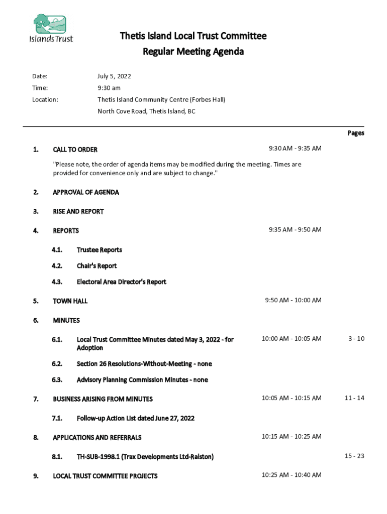 Thesis Island Local Trust Committee Regular Meeting Agenda Date:July 5, 2022Time:9:30 allocation:Thesis Island Community Center (Forbes Hall) North Cove Road, Thesis Island, BC Pages1.CALL TO ORDER9:30