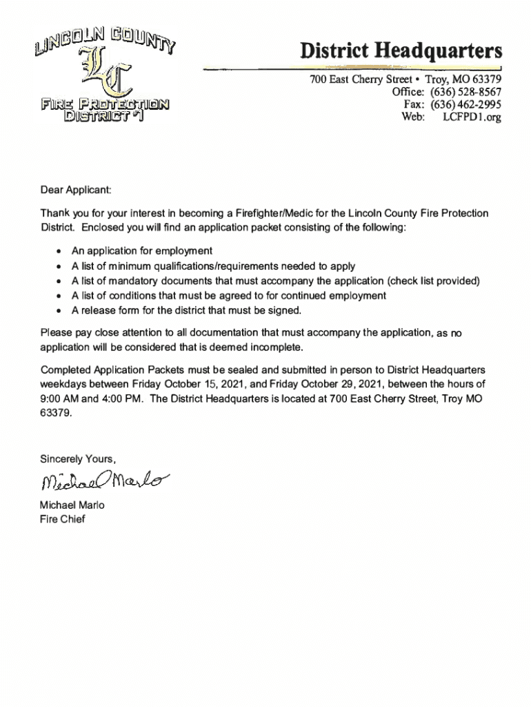 District Headquarters 700 East Cherry Street Troy, MO 633 79 Office: (636) 5288567 Fax: (636) 4622995 Web: LC FPD 1.order Applicant: Thank you for your interest in becoming a Firefighter/Medic for