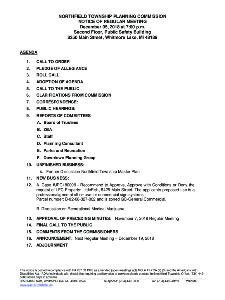 NORTHFIELD TOWNSHIP PLANNING COMMISSION NOTICE OF REGULAR MEETING December 05, 2018, at 7:00 p.m. Second Floor, Public Safety Building 8350 Main Street, Whitmore Lake, MI 48189 AGENDA 1.CALL TO ORDER2.PLEDGE