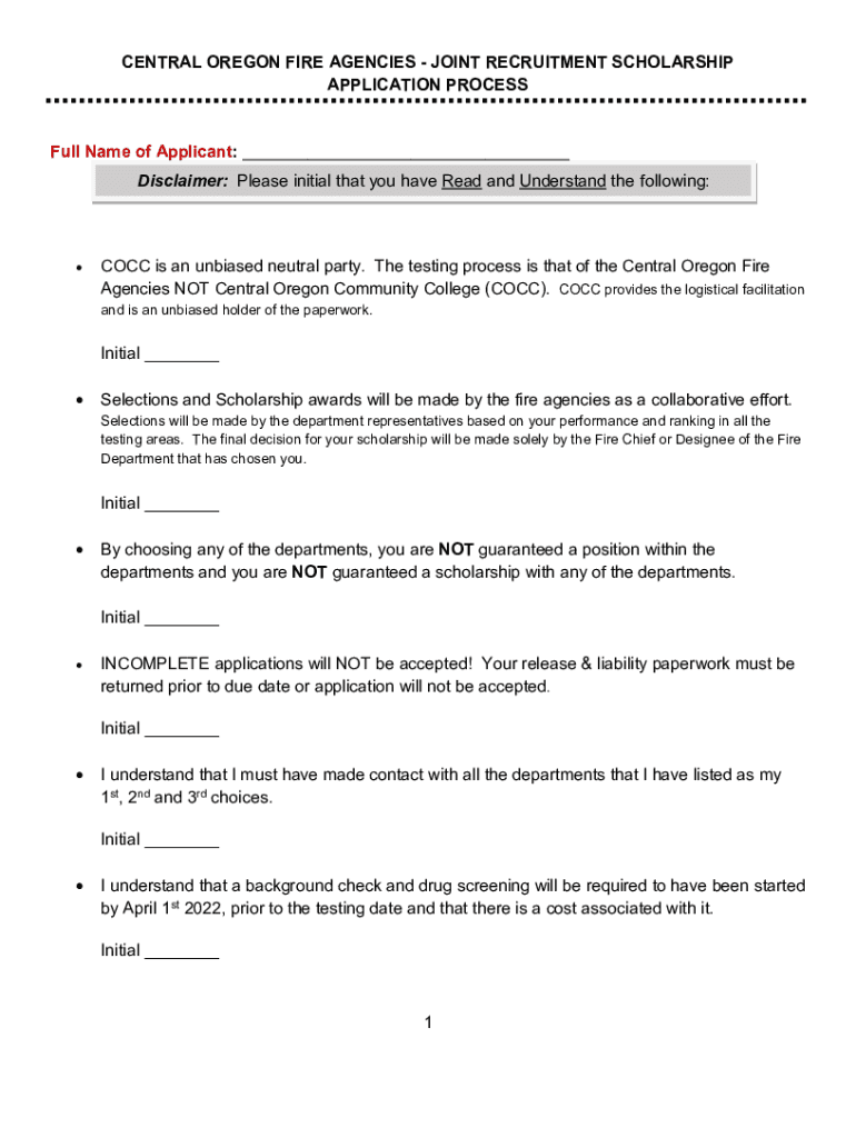 CENTRAL OREGON FIRE AGENCIES JOINT RECRUITMENT SCHOLARSHIP APPLICATION PROCESS Full Name of Applicant: ___ Disclaimer: Please initial that you have Read and Understand the following:CCC is an unbiased