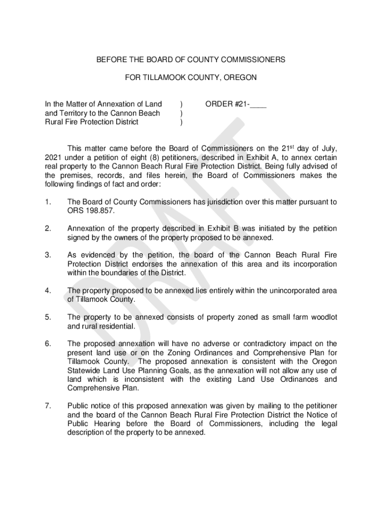 BEFORE THE BOARD OF COUNTY COMMISSIONERS FOR BILLHOOK COUNTY, Oregonian the Matter of Annexation of Land and Territory to the Cannon Beach Rural Fire Protection District)))ORDER #21___This matter