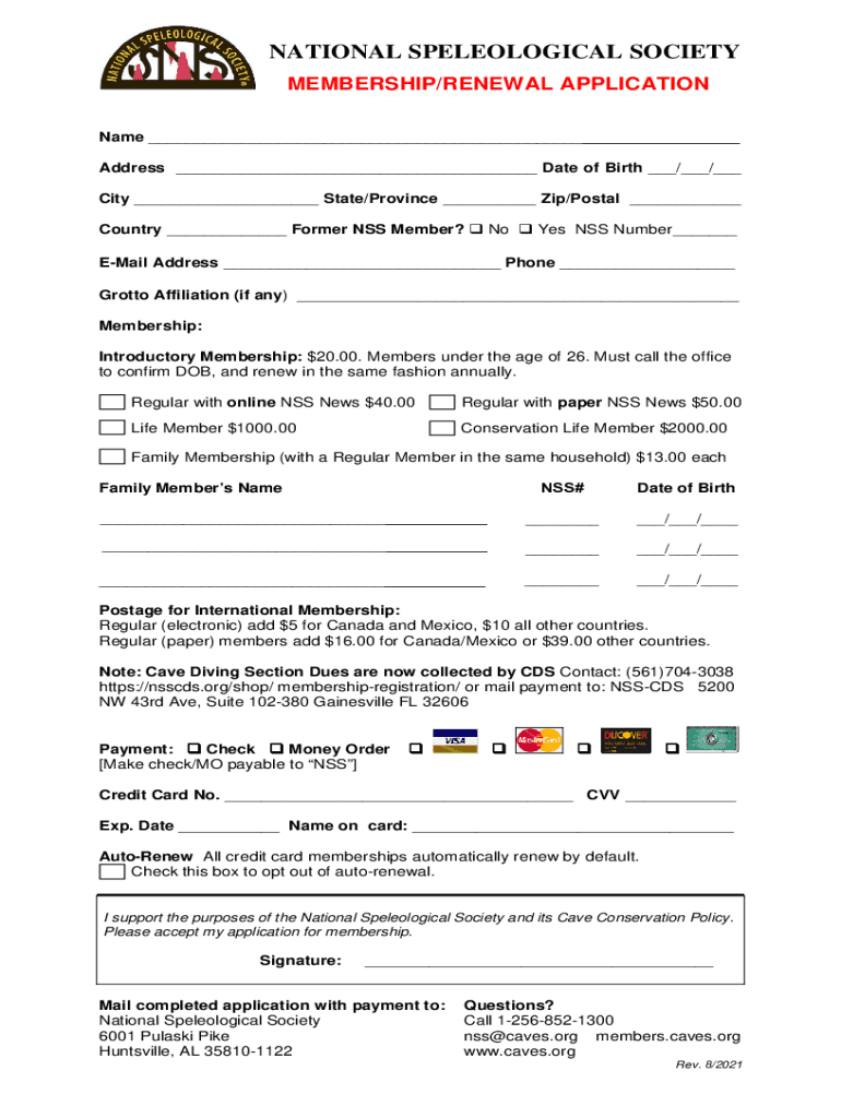 NATIONAL SPELEOLOGICAL SOCIETY MEMBERSHIP/RENEWAL APPLICATION Name ___ Address ___ Date of Birth ___/___/___ City ___ State/Province ___ Zip/Postal ___ Country ___ Former NSS Member? No Yes NSS Number___