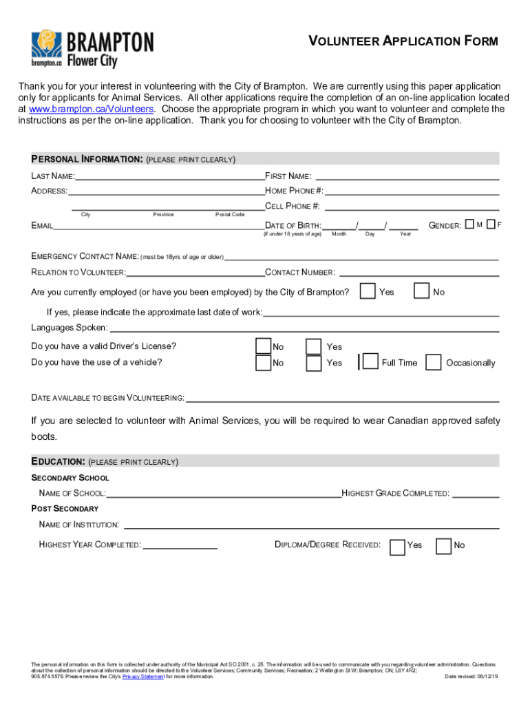 VOLUNTEER APPLICATION FORM Thank you for your interest in volunteering with the City of Brampton. We are currently using this paper application only for applicants for Animal Services. All other applications