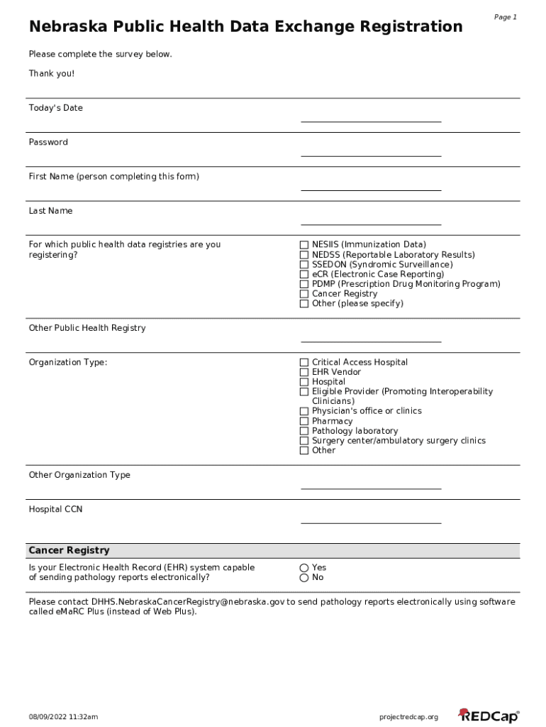 Nebraska Public Health Data Exchange Registration Page 1Please complete the survey below. Thank you! Today\'s DatePasswordFirst Name (person completing this form)Last Name which public health data