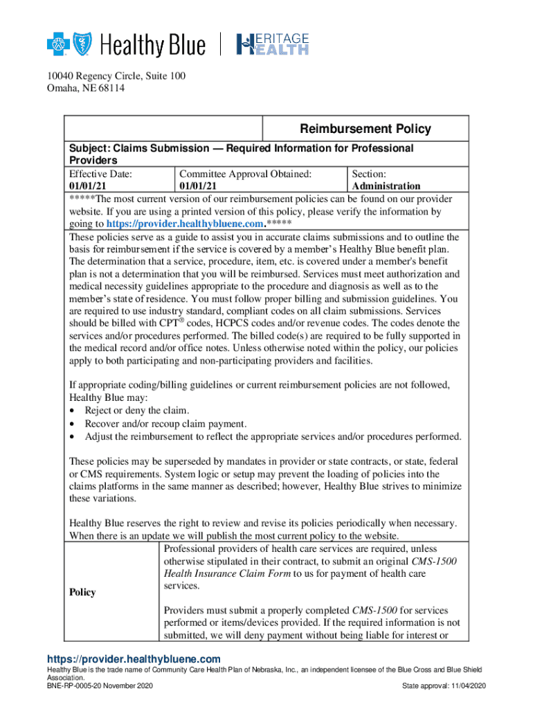 10040 Regency Circle, Suite 100 Omaha, NE 68114Reimbursement Policy Subject: Claims Submission Required Information for Professional Providers Effective Date: Committee Approval Obtained: Section: