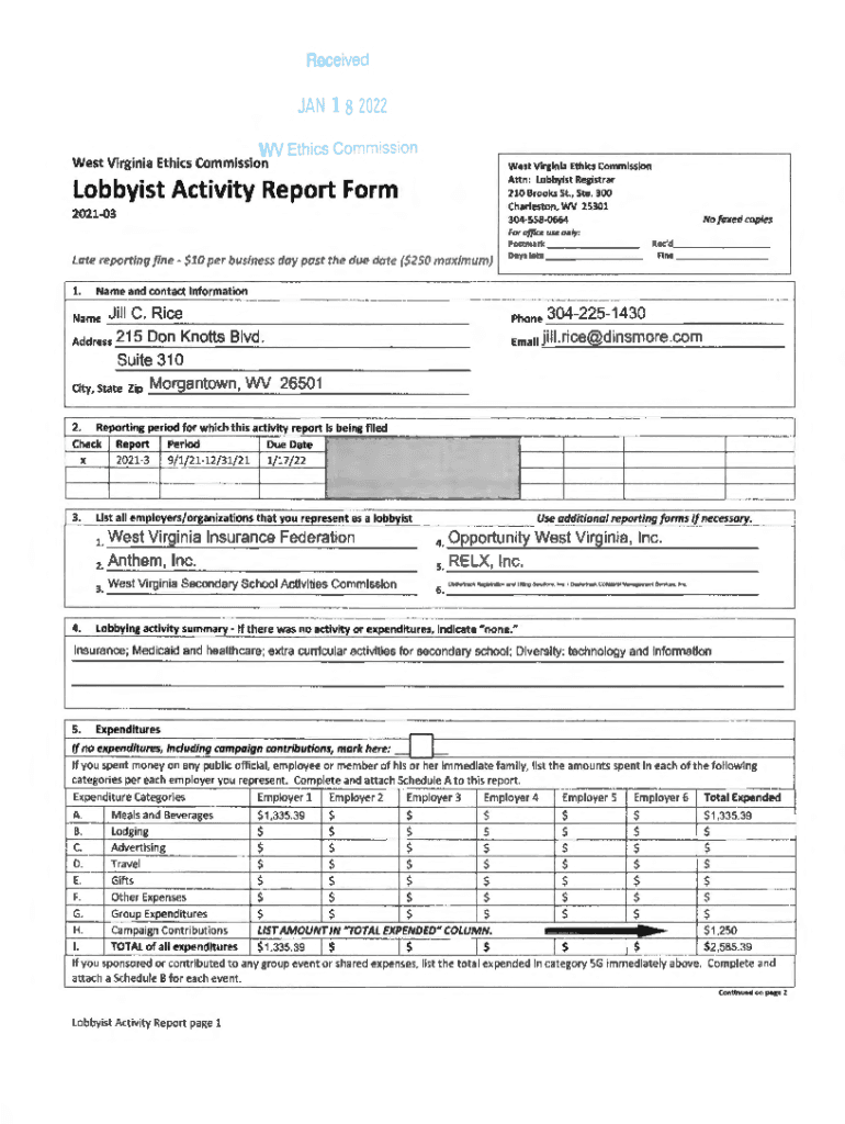 Rece1 median 18 2022 Ethics Co!\'l\” RI s011West Virginia Ethics Commission West Virginia Ethics Commission Attn: Lobbyist Registrar 210 Brooks St., Ste. 300 Charleston, WV 25301 3045580664Lobbyist