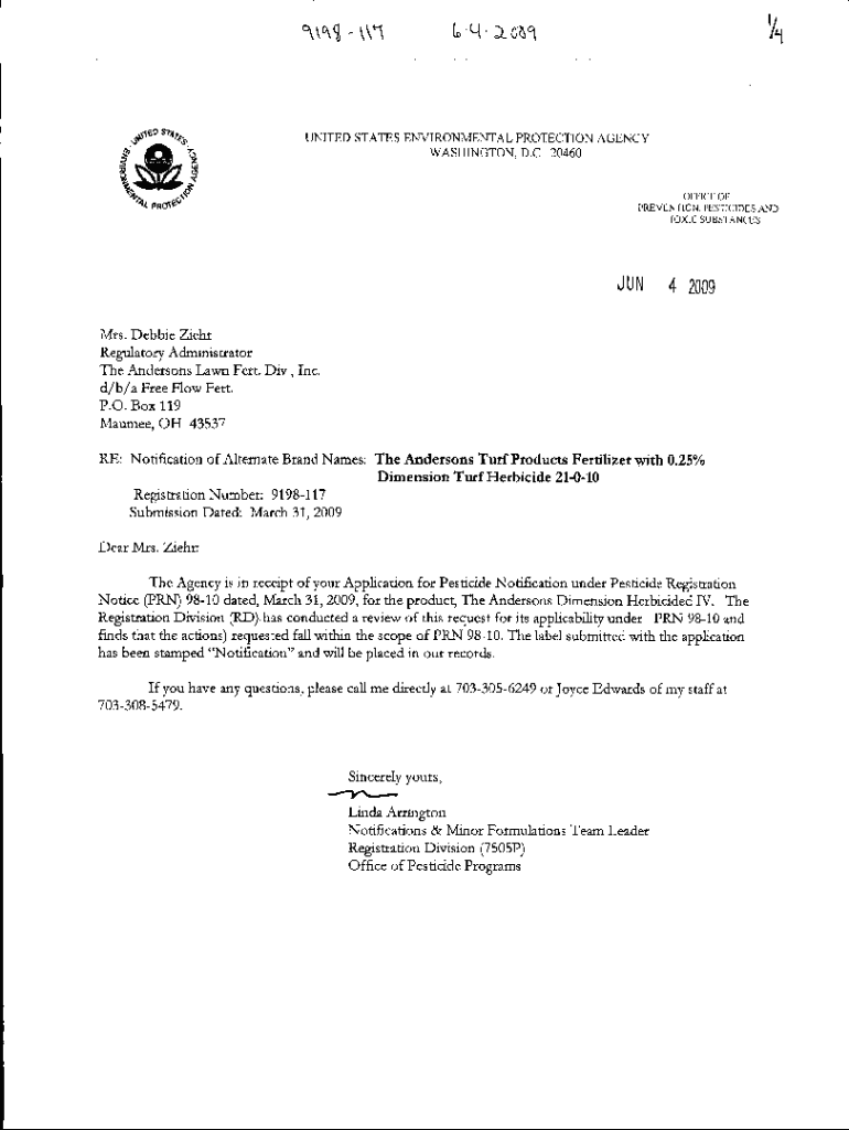 UNITED STATES ENVIRONMENTAL PROTECTION AGENCY WASHINGTON. D.C. 20460OFFICE OF PREVENTION. Pesticides AND TOXIC SUBSTANCESJUN4 2009Mrs. Debbie Tier Regulatory Administrator The Anderson's Lawn FERT.