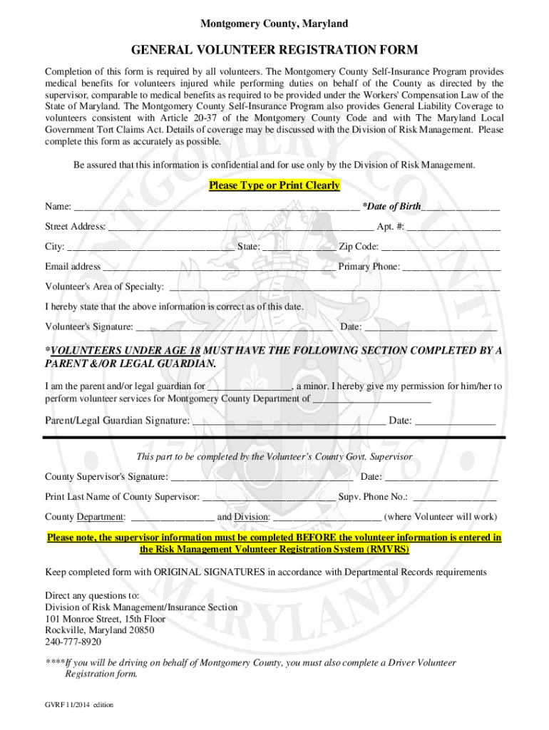 Montgomery County, MarylandGENERAL VOLUNTEER REGISTRATION FORM Completion of this form is required by all volunteers. The Montgomery County Reinsurance Program provides medical benefits for volunteers