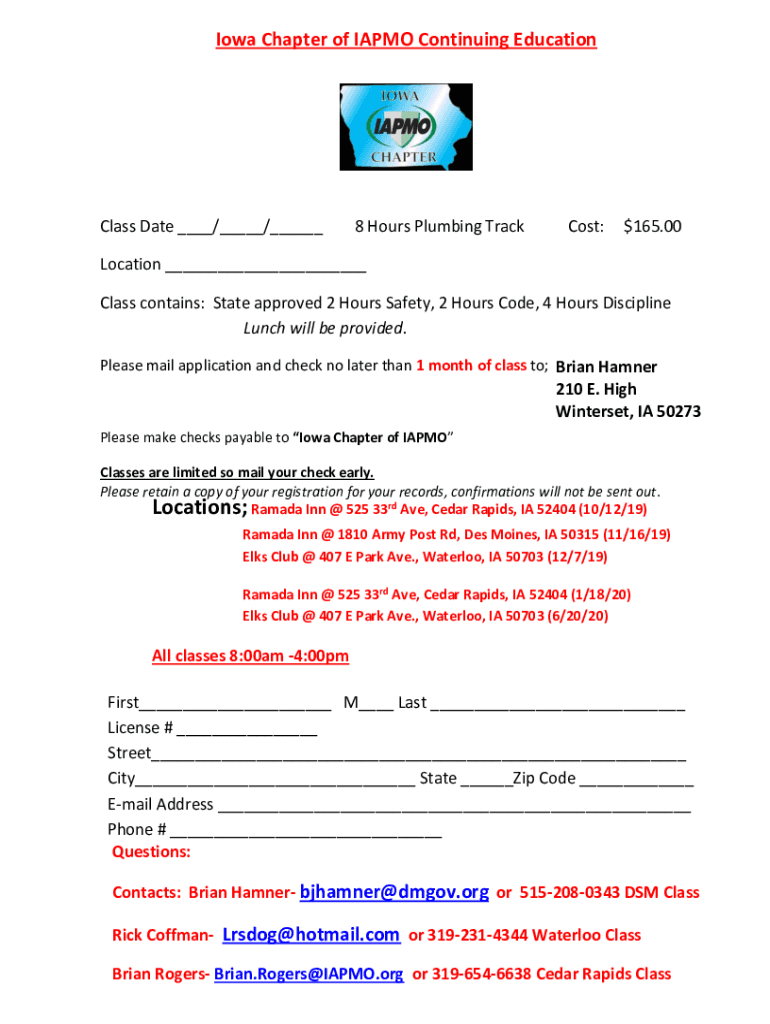Iowa Chapter of IA PMO Continuing Educationalist Date ___/___/___8 Hours Plumbing Tracks:$165.00Location ___ Class contains: State approved 2 Hours Safety, 2 Hours Code, 4 Hours Discipline Lunch will