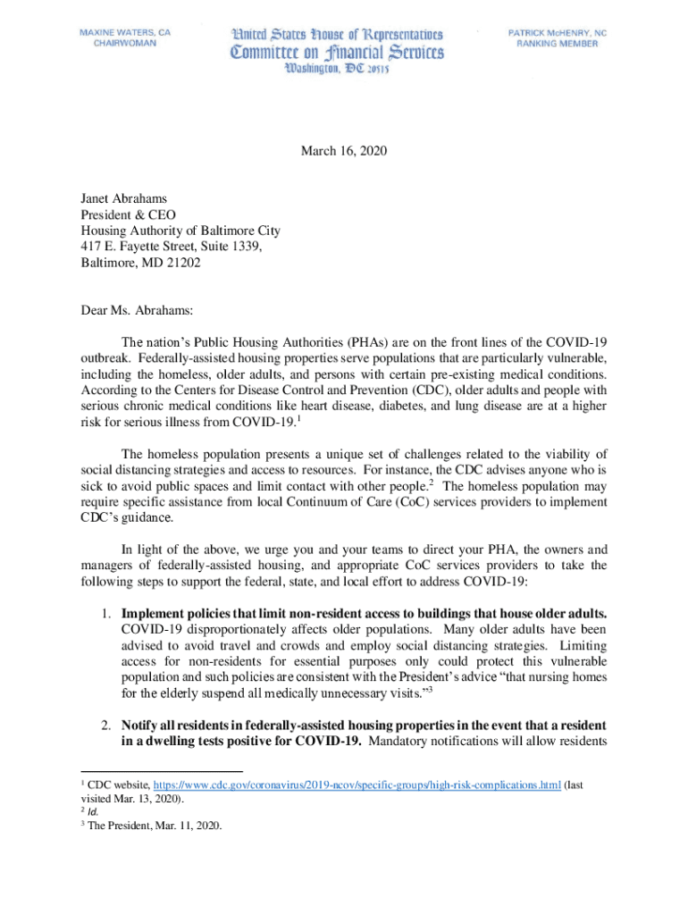 March 16, 2020Janet Abrahams President & CEO Housing Authority of Baltimore City 417 E. Fayette Street, Suite 1339, Baltimore, MD 21202Dear Ms. Abrahams: The nations Public Housing Authorities (Has)