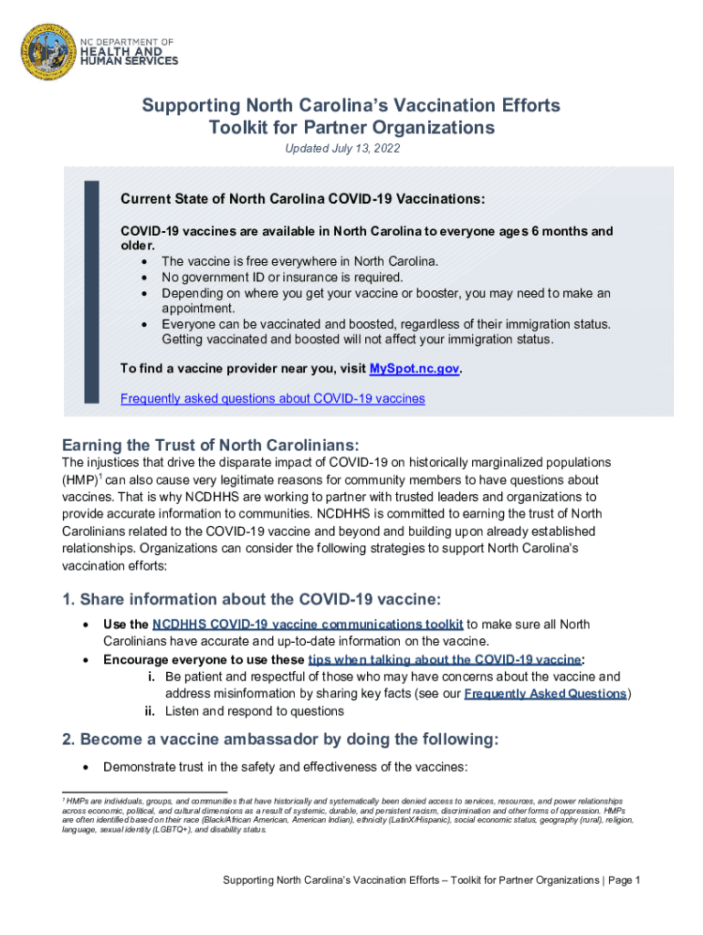 Supporting North Carolina's Vaccination Efforts Toolkit for Partner Organizations Updated July 13, 2022Current State of North Carolina COVID-19 Vaccinations: COVID-19 vaccines are available in North