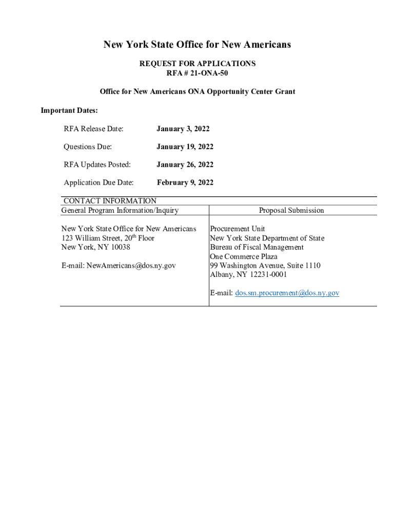 New York State Office for New Americans REQUEST FOR APPLICATIONS RFA # 21ONA50 Office for New Americans ON Opportunity Center Grant Important Dates: RFA Release Date:January 3, 2022Questions Due:January
