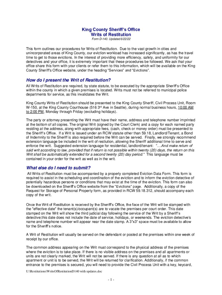 King County Sheriffs Office Writs of Restitution Form D140. Updated 6/22/22This form outlines our procedures for Writs of Restitution. Due to the vast growth in cities and unincorporated areas of