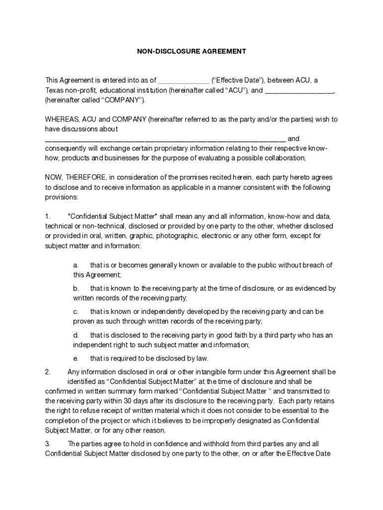 NONDISCLOSURE Agreements Agreement is entered into as of (Effective Date), between ACU, a Texas nonprofit, educational institution (hereinafter called ACU), and ___, (hereinafter called COMPANY).