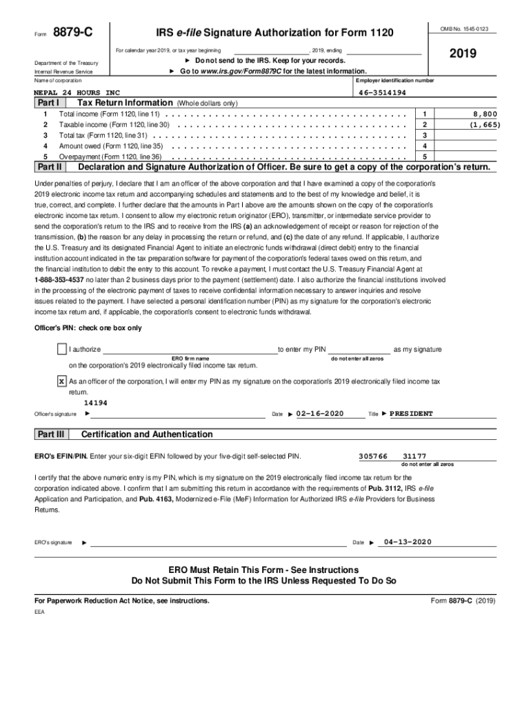 1120EFEF Transmission Status2019(Keep for your records) Name(s) as shown on return EIN numberNEPAL 24 HOURS INC463514194The following will be transmitted to the IRS.11207004AmendedThe following state