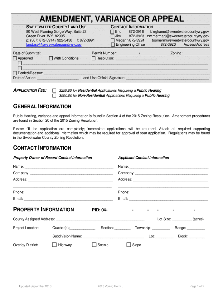 AMENDMENT, VARIANCE OR APPEAL SWEETWATER COUNTY LAND RECONTACT INFORMATION Eric 8723916 binghame@sweetwatercountywy.gov Jim 8723923 zimmermanj@sweetwatercountywy.gov Megan 8723924 toomerm@sweetwatercountywy.gov